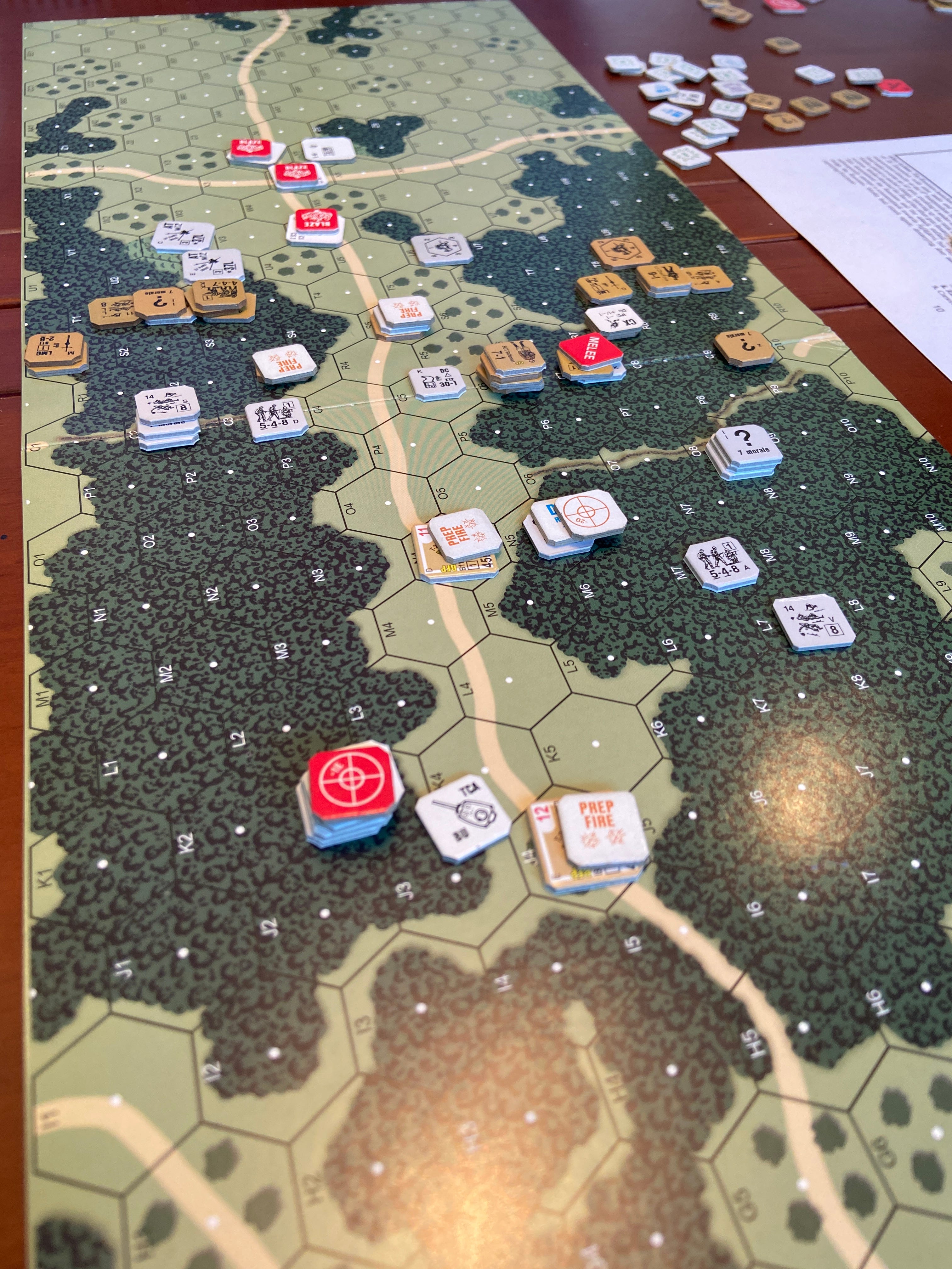 We played scenario BFP-158, Mutka Strikes Again, which is a Chas Smith design — he’s designed the bulk of the 44 scenarios. To my mind Chas, Pete Shelling, and Mark Pitcavage by the far the most interesting and reliable ASL scenario designers, so it’s always great to get a bunch of new ones from one of them. It again highlights the uniqueness of the Winter War, with some heavily outnumbered Finns ambushing an exposed Soviet column and then trying to fight a delaying action through dense woods in the snow. Delaying actions are always treacherous for the defender, and while I thought I had gotten pretty good at it in other contexts the Finns are a different challenge and I just ended up getting swamped as the Soviets maneuvered around the flanks and found gaps. I really liked the scenario though.