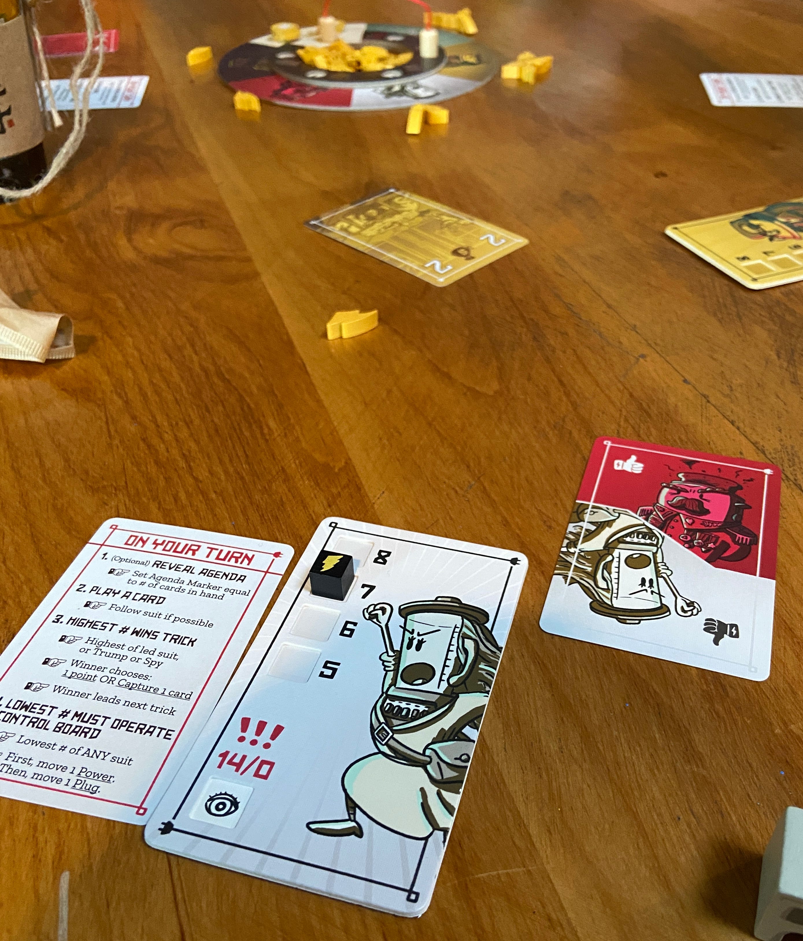 This is a game called Power Vacuum, from Keen Bean Studio. It’s another trick-taking game, but it’s just absolutely gonzo, packed full of ideas, some of which maybe should have been left out. Let’s start with the theme: we’re all anthropomorphic home appliances, and the vacuum cleaner has just died so we all have to wrestle for household supremacy.