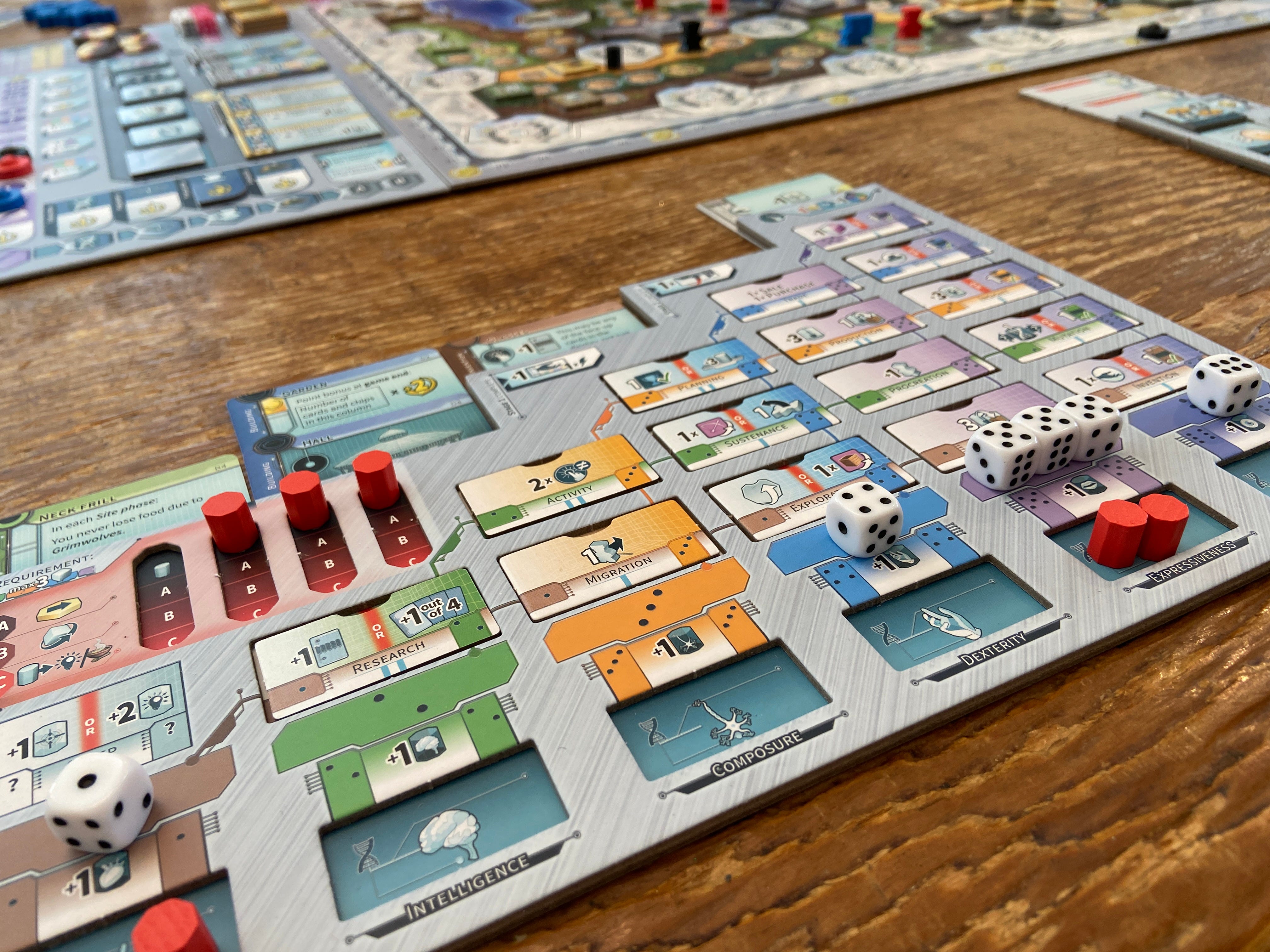 Nevertheless, I enjoyed it more than I thought I would. Would I play it again? Probably not — it’s too long and the downtime is too problematic for me. I certainly wouldn’t play it with the full compliment of 4 players. Still, it has charms. It strikes me as Stefan Feld being given a blank check to go wild and make the game he’s always wanted to make. It’s a very stereotypical Feld game, dialed up to 11. Actions are driven by dice as in Castles of Burgundy, but you use two dice at a time and every two die combination activates a different unique action, from adding population to migrating to developing technology to trading goods to manipulating dice to mutating your species. These may develop advancements in 5 different categories, produce one of 18 different types of goods, and evolve 6 different kinds of adaptations. It’s all kind of nuts. Doing anything significant involves many steps. There is very little leverage in the system.
