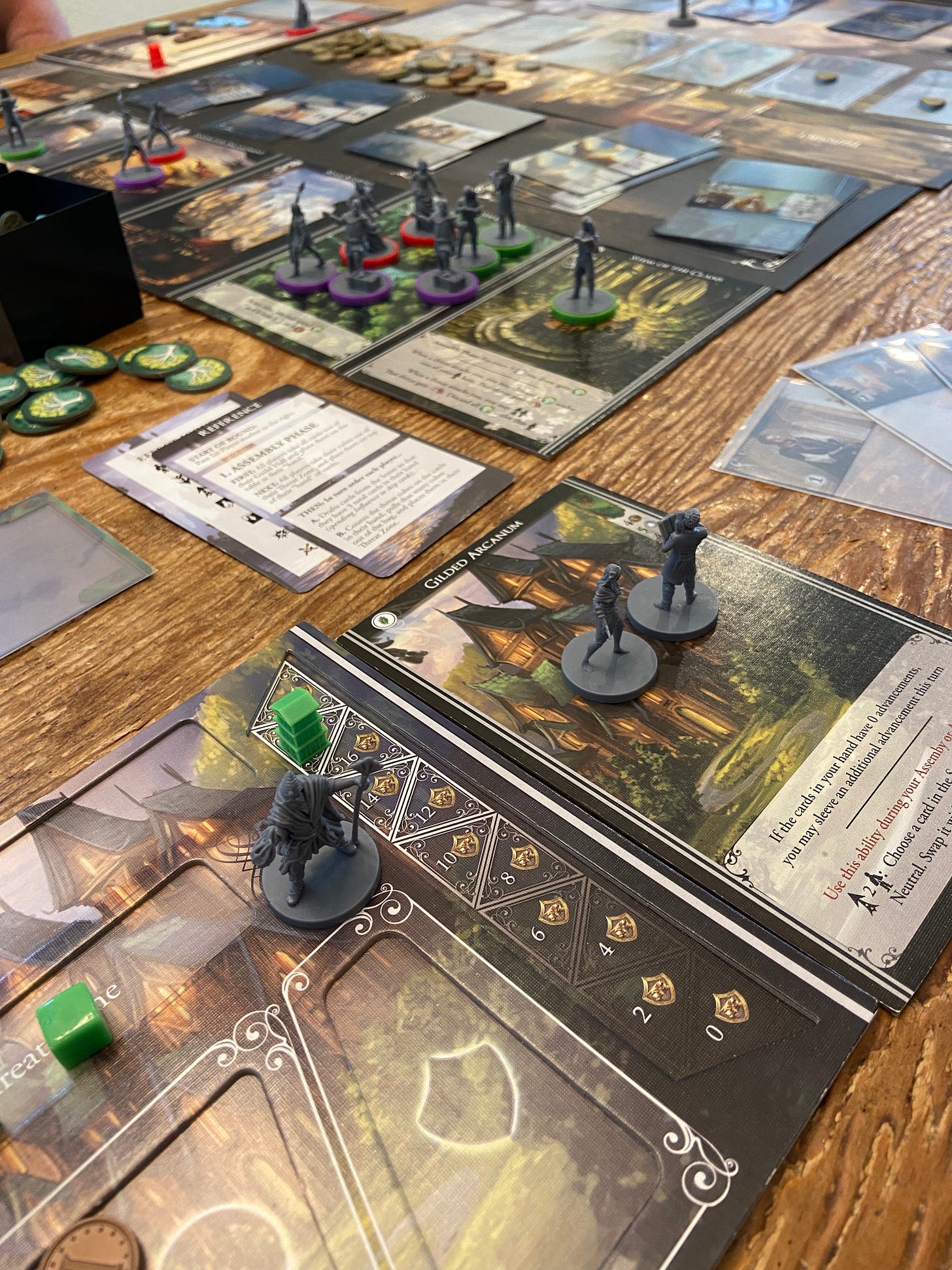 Edge of Darkness: it’s always fun for me to get a game of this in, and we tried two new-to-me bits of expansion content. First, the asymmetrical Guild House powers, which were simple and fine but inessential. Secondly, the cards and buildings from the Emissaries of the Vale expansion, which were fun. I like the different flavors of the different expansions; Emissaries of the Vale gives you powerful and flexible Growth tokens which are a currency you can earn and spend in multiple ways (depending on which buildings are in use) and add a new level of power and flexibility. I know I always say this about the game, but I love the vast range all the different building give it, and as a shared-deck-builder it has a fluidity that traditional build-your-own-deck deck builders don’t.