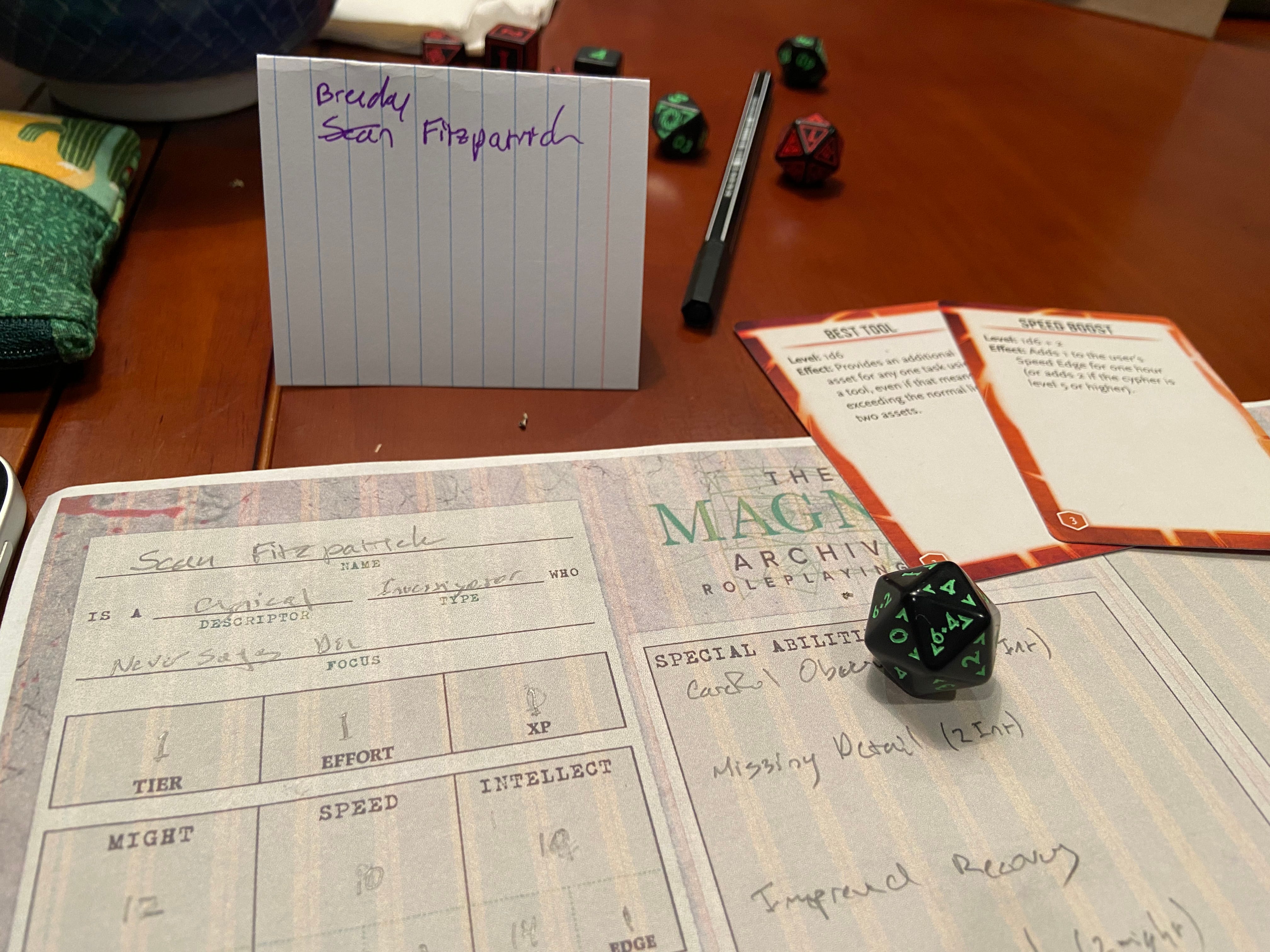 I played my first TTRPG since our Invisible Sun game concluded early in the summer: The Magnus Archives, from Monte Cook Games. This is based on a horror podcast of the same name, which I can highly recommend. I’ve wearied of the whole Cthulhu mythos thing, which I feel has become more meme than anything else and which suffers from some issues with the source material. The Magnus Archives has a strong “modern non-problematic Lovecraft” vibe of psychologically taut horror, but it has the advantage of an extra century of evolution of the form: consistent style, tighter narrative, focused world-building, and appropriately epic for a full 5-season arc. Plus of course, more relatable for the modern audience. Which is definitely helpful.