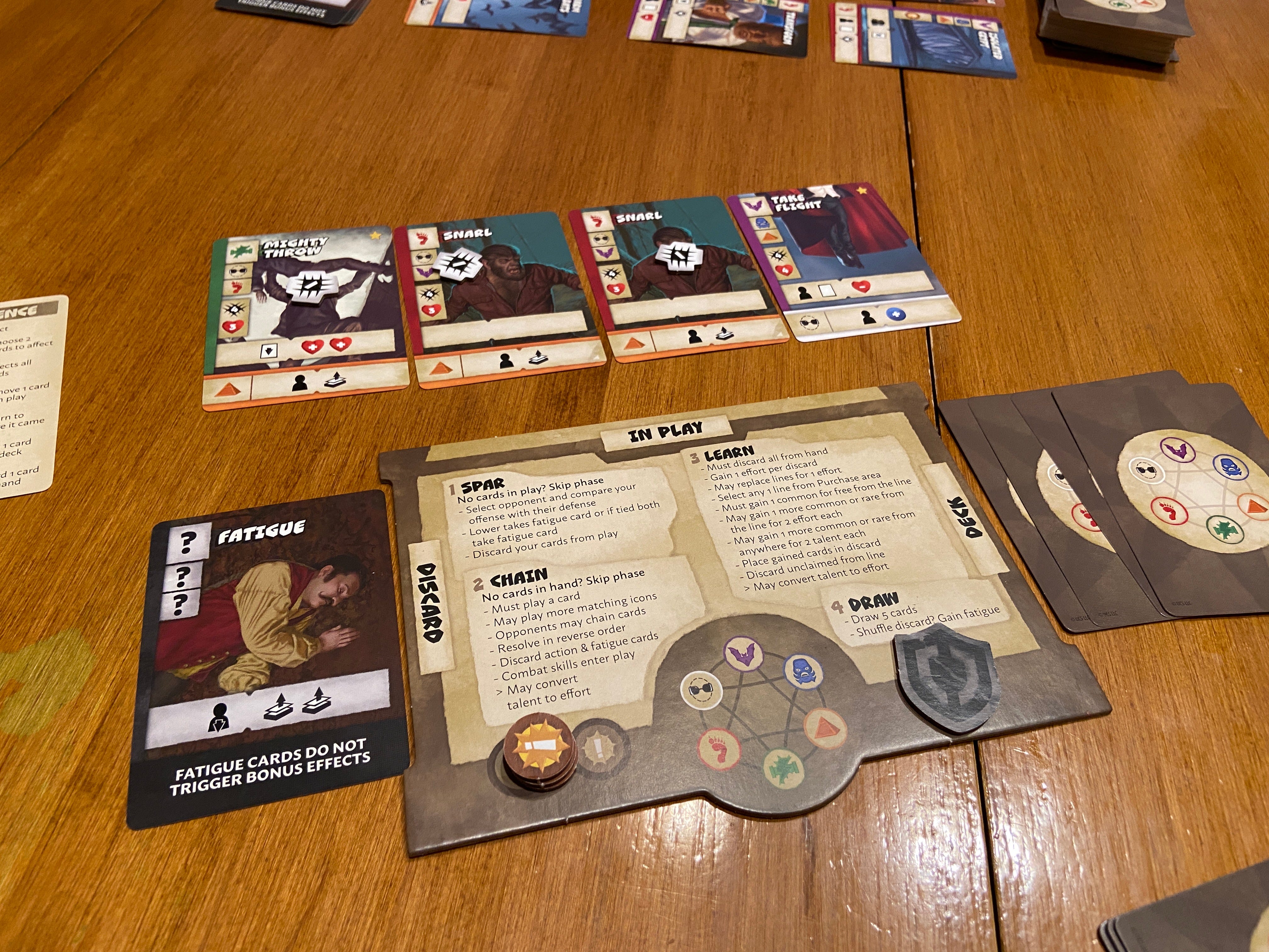 The way that everyone plays onto the chain on everyone else’s turn, and has to constantly play off other players’ cards, gives Unchained a level of speed and interactivity that is crazy compared to most other more straightforward deckbuilders. It really does have the feel of a wild melee. It can feel quite chaotic, and it is, but it also gives you lots of little ways to seek advantage. You need to be able to chain off your right-hand neighbor’s cards, but you also want to be able to develop sequences yourself. You have a hand of 5 cards which has to last you around the table, so there is more pressure on card efficiency than in most deckbuilders. Interestingly though, each time you cycle your deck you take a fatigue. This drives forward momentum because while bloating your deck with unplayable junk still isn’t helpful, adding even just ok cards gives you staying power.
