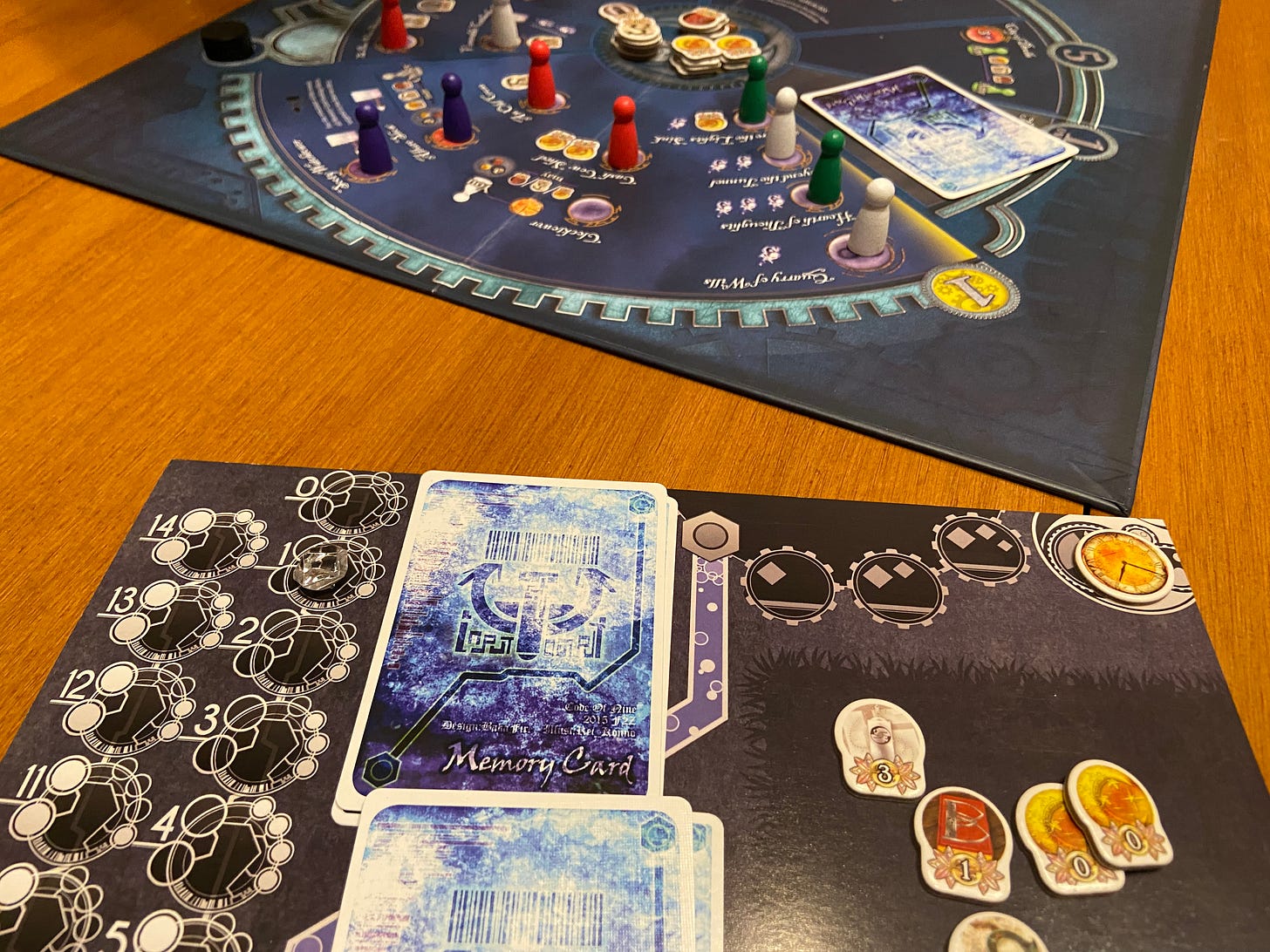 I’ve been trying to get Code of Nine to the table again for a little while. This is a Bakafire (Tragedy Looper, Sakura Arms) game from 2012. I love his games and playing this again helped me clarify what it is about his style that appeals to me. They’re mechanically clean and focused — extremely euro-y in that way — but also very thematically and narratively satisfying. In Code of Nine we play guardians trying to fulfill the wishes of a mysterious, long-dead society. In the game that means that each player has two secret cards with endgame scoring rules. There are 5 turns of a worker placement game of acquiring resources and jockeying for position, and at the end we reveal all the cards and see who best fulfilled the desires of the ancients.